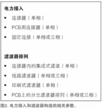 在電力接入和濾波器構造這兩方面之間(圖2),關于濾波器的構造方式(例如與內(nèi)置濾波器的固定連接、帶有集成式線路濾波器的電力進入模塊、PCB上與分立濾波器的固定連接等),大約有10個有意義的組合。