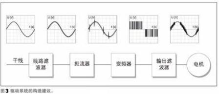 對于電力電子產(chǎn)品,特別是在驅動器領域,除了線路濾波以外,其它保護因素也會起到作用。圖3所示為某驅動系統(tǒng)的一種構造方式,不同的抑制元件在其中共同產(chǎn)生作用(定性的電壓特性)。