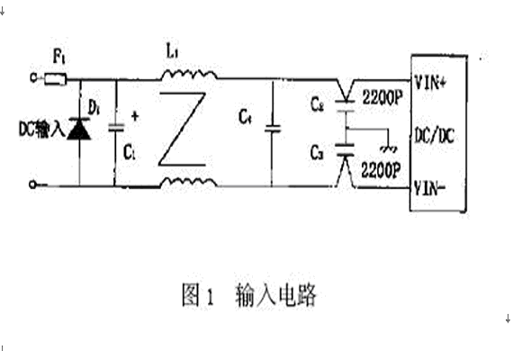 DC/DC轉(zhuǎn)換模塊一般先把直流轉(zhuǎn)換為高頻交流,再把高頻交流轉(zhuǎn)換為穩(wěn)定直流,容易形成各種噪聲,在輸入端表現(xiàn)為傳導(dǎo)噪聲和輻射噪聲。輸入濾波電路主要作用是減小輸入噪聲和阻止二次電源向輸入電源反饋的噪聲。輸入濾波器一般采用EMI濾波器,主要由共態(tài)扼流圈L1、跨接線(xiàn)路電容C1、C4以及線(xiàn)路高通濾波電容C2、C3組成。