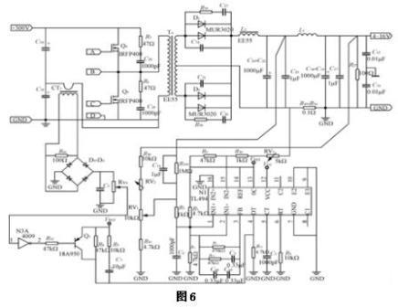 控制電路采用通用脈寬調(diào)制器TL494,具有通用性和成本低等優(yōu)點(diǎn),見圖6。輸出電壓經(jīng)R40、RV2、RV1、R41進(jìn)行分壓采樣,經(jīng)R5阻抗匹配后送到TL494腳1。RV1裝在電源前面板上用于實(shí)現(xiàn)輸出電壓的調(diào)節(jié)。R103和C14將輸出電感L1前信號采樣,經(jīng)R5送到TL494腳1,用于提高電源穩(wěn)定度,消除L1對環(huán)路穩(wěn)定性影響。