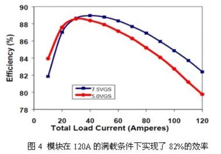 我們?cè)谑覝丨h(huán)境中對(duì)采用600LFM的空氣流量以及在500kHz頻率下工作的模塊進(jìn)行了內(nèi)電路效率測(cè)量。如圖4所示,模塊在120A的滿(mǎn)載條件下實(shí)現(xiàn)了82%的效率。根據(jù)工作頻率來(lái)優(yōu)化柵極驅(qū)動(dòng)電壓是很重要的。