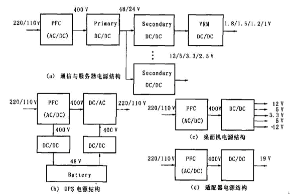 目前的通信設(shè)備電源和電腦服務(wù)器電源通常采用分布式電源結(jié)構(gòu)(distributed power system ,DPS) ,如圖1(a) 所示。 首先220V 或110V 市電經(jīng)過PFC電路變換成400V 的直流電壓;然后由一個(gè)功率相對(duì)比較大的一次DC/DC 變換器,將400V 的直流電壓變換成48 V24 V(48V 或24V) 的直流電壓給通信或服務(wù)器的主設(shè)備供電。 但是還有其他的一些設(shè)備需要更低的電壓供電,48V/24V 后面還會(huì)有很多個(gè)功率相對(duì)比較小的二次電源變換成12/5/3.3/2.5V 等的直流電壓。 通常CPU 的工作電壓更加低,而且對(duì)負(fù)載突變下的電壓調(diào)整率要求非常高,所以后面還會(huì)有一個(gè)或多個(gè)稱為電壓調(diào)整模塊( voltage regulator module ,VRM) 的DC/DC 專門給CPU供電。 有時(shí)電信公司用的主功率是48V 系統(tǒng),但是某些特殊設(shè)備是24 V供電;有時(shí)反之,所以還會(huì)用到48V→24V 或24V→48V的DC/DC電源。通常有四種DC/DC 變換器: ①400V→48/24V; ②48/24V →12/5/3.3/ 2.5 V; ③12/5/3.3 V→1.8/1.5/1.2/1 V; ④48V→24V或24V→48V。 其中①和②通常是隔離型的DC/DC。