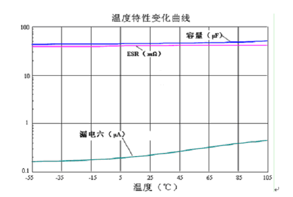4. 溫度特性穩(wěn)定,如圖1所示在-55~+105℃工作溫度范圍內(nèi),容量、ESR變化幅度小。