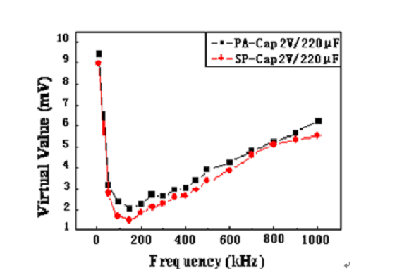 如上面的濾波效果顯示,當(dāng)開關(guān)電源頻率在300KHz左右時(shí),同種規(guī)格的PA-Cap的輸出均方根與SP-Cap的很接近,所以PA-Cap濾波效果基本接近于SP-Cap。由于具有低的ESR、允許的紋波電流大,所以PA-Cap也是DC/DC轉(zhuǎn)換器或開關(guān)電源輸出電容的優(yōu)選電容之一。