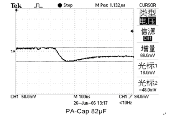 當(dāng)MPU的負(fù)載電流急劇增大時(shí),由于PA-Cap的ESR比普通鉭電容小很多,所以接上PA-Cap的電源電壓下降只有66mV比普通鉭電容小好幾倍(如圖10、11所示),達(dá)到良好的去耦效果。PA-Cap不僅去耦效果好,而且不燃燒不爆炸,是MPU等數(shù)字電路作為高速保護(hù)備用電荷庫(kù)的優(yōu)選電容之一。