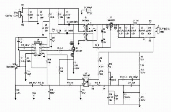 圖 3 顯示了傳統(tǒng)同步反向電源設(shè)計的完整原理圖。該設(shè)計使用了一個低成本、簡化的電流模式 PWM 控制器(即 UCC2809),對電源進行控制。除了主緩沖器以外,該電路還需要D3 和 D4 的齊納鉗位電路,以防止來自漏極電感峰值的 Q1 超高柵-源電壓。