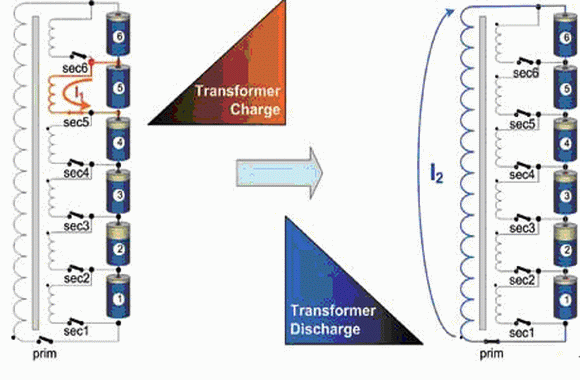 閉合主繞組開關(guān),電池組向變壓器充電。然后斷開主繞組開關(guān),閉合相應(yīng)的次繞組開關(guān)(本例中為2號次繞組開關(guān)),變壓器儲存的能量轉(zhuǎn)移到指定的電池上。