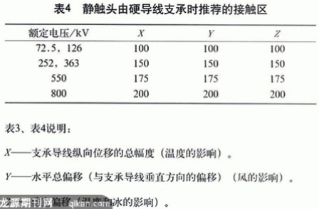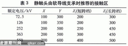 單柱垂直斷口隔離開關(guān),因其靜觸頭懸掛在母線上,為了適應(yīng)風(fēng)力、溫度和冰雪的影響,確保隔離開關(guān)能可靠合閘,GB1985對接觸區(qū)(也稱鉗夾范圍)提出了推薦值,如表3、表4。在進(jìn)行變電站設(shè)計和選用隔離開關(guān)時,應(yīng)考慮到具體運行條件,確保靜觸頭處在規(guī)定的接觸區(qū)限值之內(nèi),使隔離開關(guān)能正確地分合閘。