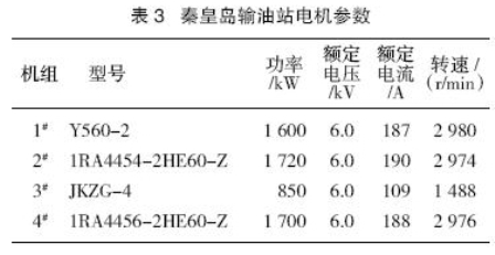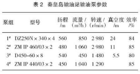 秦皇島輸油站輸油設備如表2、表3所列。秦皇島輸油站配備4臺輸油泵機組,并聯(lián)方式,直接抽10萬m3油罐外輸,且只能一臺泵機組運行。其中1#泵機組配有液力耦合器調速裝置,其它3臺均無調速裝置。冀東原油混入后,出現(xiàn)1#、2#、4#泵機組配置明顯偏大,而3#泵機組配置又有所偏低的狀況,致使輸油站外輸量降低。目前運行中以帶液力耦合器的1#輸油泵機作為主力,該泵機組為上世紀90年代初期國產(chǎn)產(chǎn)品,效率低,故障率高;而于2003 年與2004年相繼更換的2#、4#泵機組(進口設備)因揚程、排量過大,目前基本處于閑置狀態(tài)。