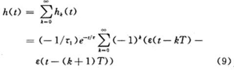 由式(8)可見,第k段的非零值時區(qū)為(kT,(k+1)T_),即各時段非零值區(qū)間互不重疊,對hk(t)關(guān)于k求和,得開關(guān)電容電路(對外)的單位沖激零狀態(tài)響應(yīng)h(t)為: