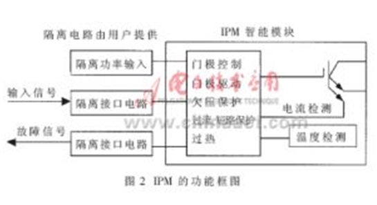 IPM的功能框圖如圖2所示。IPM內(nèi)置驅(qū)動和保護(hù)電路,隔離接口電路需用戶自己設(shè)計。