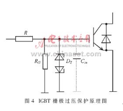 IGBT的驅(qū)動設(shè)計問題亦即MOSFET的驅(qū)動設(shè)計問題;設(shè)計時應(yīng)注意以下幾點(diǎn):①IGBT柵極耐壓一般在±20V左右,因此驅(qū)動電路輸出端要給柵極加電壓保護(hù),通常的做法是在柵極并聯(lián)穩(wěn)壓二極管或者電阻。前者的缺陷是將增加等效輸入電容Cin,從而影響開關(guān)速度,后者的缺陷是將減小輸入阻抗,增大驅(qū)動電流,使用時應(yīng)根據(jù)需要取舍。圖4為IGBT柵極保護(hù)原理圖,其中,RG、DZ、Cin分別為等效柵極阻抗、穩(wěn)壓管和等效輸入電容。②盡管IGBT所需驅(qū)動功率很小,但由于MOSFET存在輸入電容Cin,開關(guān)過程中需要對電容充放電,因此驅(qū)動電路的輸出電流應(yīng)足夠大,這一點(diǎn)設(shè)計者往往忽略。假定開通驅(qū)動時,在上升時間tr內(nèi)線性地對MOSFET輸入電容Cin充電,則驅(qū)動電流為