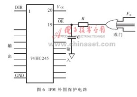 方案一 PWM接口電路前置74HC245、74HC244等帶控制端的三態(tài)收發(fā)器,如圖6所示。IPM的控制信號經(jīng)過74HC245的輸入、74HC245的輸出后送至IPM接口電路;各個IPM的故障輸出信號經(jīng)光耦隔離輸出后得到高電平FO,送入或門,或門輸出經(jīng)過R-C低通濾波器后,送入74HC245的使能端/OE。IPM正常工作時,或門輸出為低電平,74HC245選通;IPM故障報警時,或門輸出為高電平,74HC245所有輸出置為高阻,封鎖各個IPM的控制信號,關(guān)斷IPM;實現(xiàn)了保護(hù)功能。