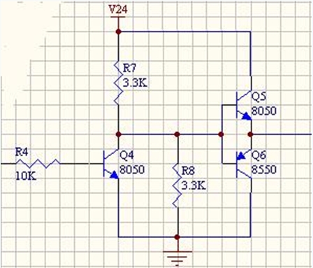 后面三極管和電阻,穩(wěn)壓管組成的電路進一步放大信號,驅動場效應管的柵極并利用場效應管本身的柵極電容(大約1000pF)進行延時,防止H橋上下兩臂的場效應管同時導通(“共態(tài)導通”)造成電源短路。