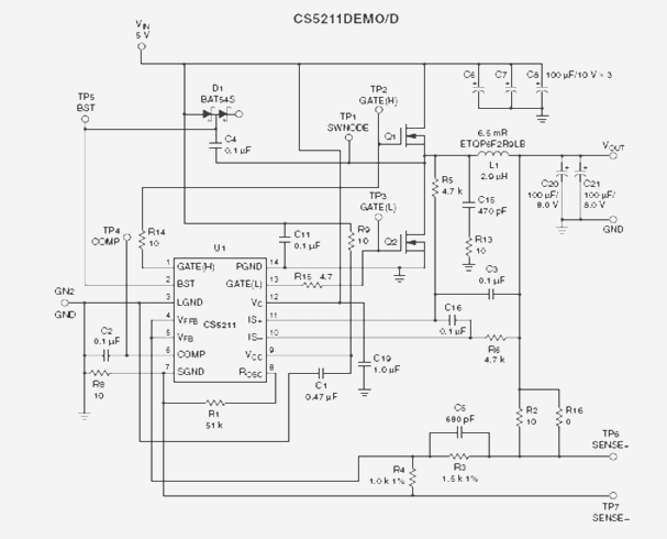 根據(jù)DC/DC變換器生產(chǎn)商提供的評估板資料和典型應(yīng)用電路,PA-Cap作為濾波電容在DC/DC變換器CS5211DEMO/D評估板線路中的應(yīng)用,實驗的線路原理圖如圖2。