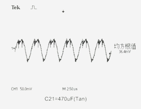 電路中電壓輸入端C6.7.8接入PA-Cap 6.3V/22μF。在輸出端C20.21位置分別接上鉭電解電容器:10V/470μF、16V/220μF和PA-Cap聚合物電容器:10V/22μF、4V/82μF作為濾波電容器,用示波器測量電路的輸出紋波電壓Vr。