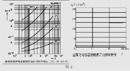 而鋁電解電容器的損耗非常大,其中用功損耗可以占到總無功容量的20%,且鋁電解電容器有功損耗隨著頻率的增大而增大,頻率超過1000赫茲損耗變化率逐漸增大,當頻率超過10000赫茲后變化率急劇增加,有功損耗增大,發(fā)熱量增大。圖2中顯示了鋁電解電容器損耗頻率特性(國外某著名鋁電解電容器生產公司提供),這也正是長久以來在中、高頻大功率環(huán)境下采用鋁電解直流濾波電容器發(fā)熱量大、故障率高的根本原因。而金屬化電容器固有損耗非常小,整臺電容器損耗小于2‰,僅為鋁電解電容器1%,且采用聚丙烯薄膜作為介質,產品頻率特性很穩(wěn)定,如圖2所示,故在中、高頻環(huán)境下采用金屬化直流濾波電容器,可以大幅度降低線路損耗,避免發(fā)熱,穩(wěn)定性非常高。