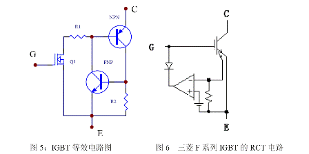 IGBT 有一定抗過(guò)電流能力,但必須注意防止過(guò)電流損壞。IGBT 復(fù)合器件內(nèi)有一個(gè)寄生晶閘管,所以有擎住效應(yīng)。圖5 為一個(gè)IGBT 的等效電路,在規(guī)定的漏極電流范圍內(nèi),NPN 的正偏壓不足以使NPN 晶體管導(dǎo)通,當(dāng)漏極電流大到一定程度時(shí),這個(gè)正偏壓足以使NPN 晶體管開(kāi)通,進(jìn)而使NPN 和PNP 晶體管處于飽和狀態(tài),于是寄生晶閘管開(kāi)通,門極失去了控制作用,便發(fā)生了擎住效應(yīng)。IGBT 發(fā)生擎住效應(yīng)后,漏極電流過(guò)大造成了過(guò)高的功耗,最后導(dǎo)致器件的損壞。