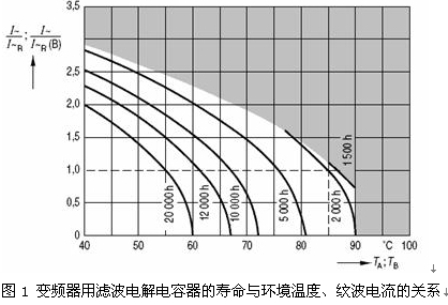 圖1為變頻器用濾波電解電容器的壽命與環(huán)境溫度、紋波電流的關(guān)系(日立電解電容器的數(shù)據(jù)表中沒有給出這樣的曲線)。