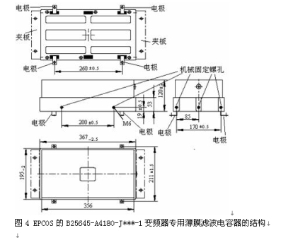 以EPCOS的B25645-A4180-J***-1變頻器專用薄膜濾波電容器的結(jié)構(gòu)為例,如圖4。電容器的引出端為銅板,裝配方式可以是將電極用螺栓固定在直流母線板的正、負極,實現(xiàn)電氣連接,這樣的電氣連接電容器與直流母線所包圍的空間將非常小,因而所產(chǎn)生的寄生電感也將非常小。再用L型固定夾板將電容器模塊固定在散熱器上,完成電容器模塊的機械固定,如圖3的安裝方式 。