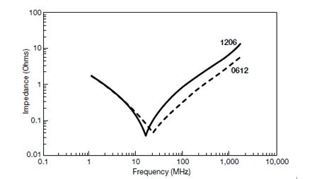 對于各類表面貼裝的不同封裝的電感值,可以利用方程2中所描述的測量技術(shù)來計算。例如,如果系統(tǒng)中產(chǎn)生了800MHz的噪聲,隨后可以在PCB上將其定位到一個確定的區(qū)域。選擇一個標(biāo)稱容量為39pF的電容,并將其安裝到盡可能靠近產(chǎn)生噪聲的地方,這對于減小EMI來說,將是最好的選擇。減小矩形芯片電感的一個有效方式就是改進(jìn)芯片縱長方向端頭的設(shè)計。所選電容器的阻抗曲線如圖4所示。注意通過改變縱橫比,寄生電感減小了大約50%,即從1200pH減小到600pH。這有效地偏移開了最大衰減點,故在利用這些器件來進(jìn)行EMI濾波時只需牢記這一點。