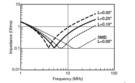 引腳所產(chǎn)生的電感對阻抗的影響如圖6所示。一個很好的經(jīng)驗算法是,電路板上每0.10"的引腳長度將產(chǎn)生2.5nH的電感。就像低電感電容器將頻率向高處偏移一樣,引腳器件將頻率往低端偏移。要實現(xiàn)最佳的EMI濾波,必須牢記這一點。