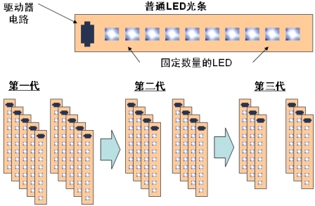 首先,在模塊化途徑替代金鹵燈光源方面,可使每個(gè)LED光條采用固定數(shù)量的LED。隨著LED在光輸出等方面性能的持續(xù)提升,要提供相同的總光能輸出,就可以使用更少的LED光條,從而降低需要使用的LED的成本,參見(jiàn)圖3。