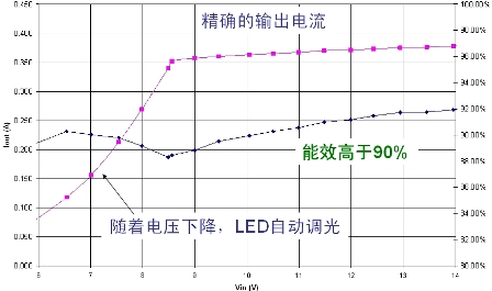 f圖4:NCP3066驅(qū)動(dòng)8個(gè)CREE XRE LED時(shí)的輸出電流與輸入電壓曲線圖。