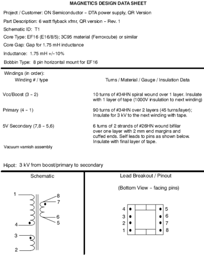 電流感測變壓器T2的設計并非最關鍵的事項,可以采用任何匝數(shù)比在30:1至50:1的小型鐵芯就可以使用。然而,主反激變壓器T1的設計對能效及優(yōu)化電源性能而言非常關鍵。我們并不建議重新設計磁芯結構更小(磁芯橫截面積Ae更小)的變壓器。使用橫截面積較大的磁芯可能使總匝數(shù)較少,并有可能增量提升能效,但為了恰當?shù)碾娐饭ぷ?,需要維持規(guī)定的電感值。