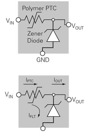 在正常工作時,VIN輸入電壓高于齊納二極管的擊穿電壓VZ,有IFLT電流經(jīng)齊納二極管到地,VOUT輸出穩(wěn)定的電壓。有不正常的過壓輸入 VIN時,則齊納二極管的IFLT會產(chǎn)生過流,當器件上有過流時,其電阻由低阻態(tài)瞬變到高阻態(tài),使在其上的壓降大增,VOUT輸出基本不變,而流過齊納二極管的電流IFLT反而減小,如圖16所示。器件上電壓降的增大既保護了齊納二極管,又保護了下游的電路。另外,若被保護的下游電路中存在有局部短路或短路故障時,IOUT會增加,PPTC元件由低阻態(tài)變成高阻態(tài),可使電路得到過流保護。
