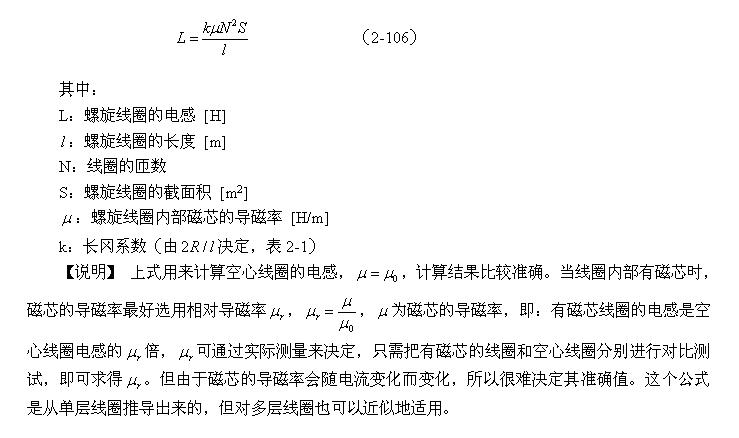 【說(shuō)明】上式是用來(lái)計(jì)算多層線圈繞組、截面為圓形的空心線圈的電感計(jì)算公式。長(zhǎng)岡系數(shù)k可查閱表2-1,系數(shù)c可查閱表2-2。當(dāng)線圈內(nèi)部有磁芯時(shí),有磁芯線圈的電感是空心線圈電感的