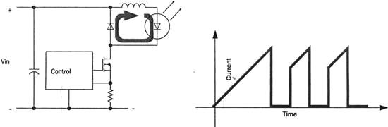 最簡單的開關(guān)穩(wěn)壓器是圖2所示的降壓穩(wěn)壓器,輸入電壓與LED電壓之間的壓差對電感L充電,電流隨之增加,當(dāng)電流達(dá)到預(yù)設(shè)的值時,控制電路將串聯(lián)的晶體管關(guān)閉,在LED通路形成一個交變電流。注意,在LED驅(qū)動應(yīng)用中,開關(guān)穩(wěn)壓電路控制電流的峰值。