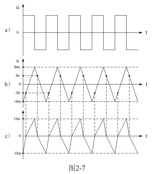 對(duì)應(yīng)輸入交流脈沖電壓變化的曲線圖;圖2-7-c為變壓器鐵芯中磁場(chǎng)強(qiáng)度H對(duì)應(yīng)磁通密度B或磁通