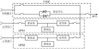 目前,為了提高UPS的可靠性,主要采用主從結構的UPS“1+1”并聯(lián)備份,如圖4所示。雖然這樣在一定程度上提高了供電可靠性,但是不便于離線維護、擴容,同時也造成設備利用不充分、缺乏靈活性等方面的缺陷。對于一些不能夠停電的用戶(例如醫(yī)療、銀行、金融、通信、國防等行業(yè)),UPS“1+1”并聯(lián)備份,還是存在很大的電力系統(tǒng)癱瘓隱患。