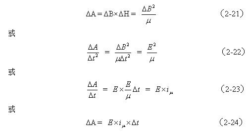 在圖2-12中,ΔA是在變壓器鐵芯磁滯回線中任意取出來進(jìn)行分析的面積,ΔA面積的取值可以任意的小,以保證在此面積中變壓器鐵芯的導(dǎo)磁率可以看成是一個(gè)常數(shù)。與ΔA面積對(duì)應(yīng)的有磁感應(yīng)強(qiáng)度增量ΔB和磁場強(qiáng)度增量ΔH以及時(shí)間增量Δt。根據(jù)磁場強(qiáng)度、磁通密度的定義,以及電磁感應(yīng)的定理,可以列出下面關(guān)系試關(guān)系式: