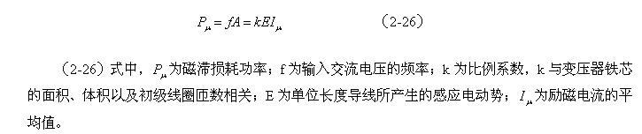(2-25)式中,A為一個(gè)周期內(nèi)變壓器鐵芯的磁滯損耗,單位是焦耳;E為單位長度導(dǎo)線所產(chǎn)生的感應(yīng)電動(dòng)勢,單位為伏; 為勵(lì)磁電流的平均值,單位為安培;T為輸入交流電壓的周期,單位為秒,f為脈沖頻率,或開關(guān)電源的工作頻率,單位為赫芝;k為比例系數(shù),它是一個(gè)與選用單位制和變壓器鐵芯面積、體積以及初級(jí)線圈匝數(shù)等參數(shù)相關(guān)的常量。在(2-21)、(2-22)、(2-23)、(2-24)式中,沒有比例系數(shù)k,是為了使問題簡單,便于分析。