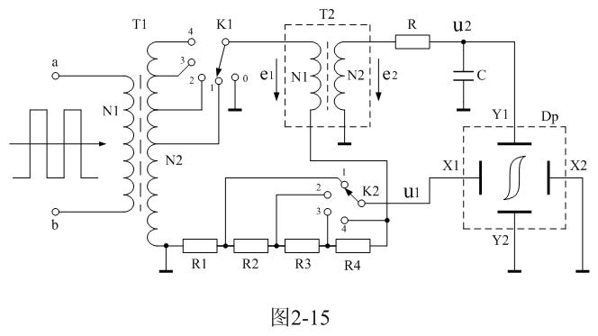 在圖2-15中,變壓器T1為信號(hào)源,通過(guò)K1選擇變壓器T1次級(jí)線圈的抽頭就可以改變信號(hào)源的電壓輸出;T2為待測(cè)變壓器樣品,Dp為示波器;R1、R2、R3、R4為顯示磁場(chǎng)強(qiáng)度H的取樣電阻,取樣電壓u1作為示波器X軸偏轉(zhuǎn)顯示輸入電壓,通過(guò)K2可以選擇取樣電壓輸出,從而可以改變示波器X軸偏轉(zhuǎn)顯示的寬度;電阻R和電容C為積分電路,積分電壓u2由電容C兩端輸出,作為示波器Y軸偏轉(zhuǎn)顯示輸入電壓,以顯示磁通密度B。