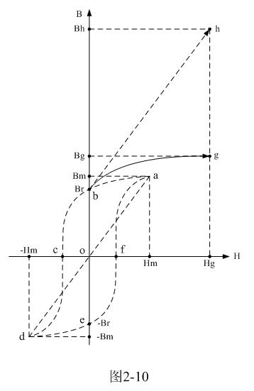 但當(dāng)變壓器鐵芯中的磁化過程是從上次剩余磁通密度Br的位置開始時,上面所分析的理想磁化過程將要被破壞,磁通密度B不會再沿著理想磁化曲線d-a進行,而是沿著另一條新的等效磁化曲線進行;這條新的等效磁化曲線應(yīng)該與原理想磁化曲線d-a平行,并且經(jīng)過Br點,圖2-10中虛線b-h就是這條新的等效磁化曲線的一部分。這里只畫出新等效磁化曲線的一半,另一半在圖2-10中沒有畫出。