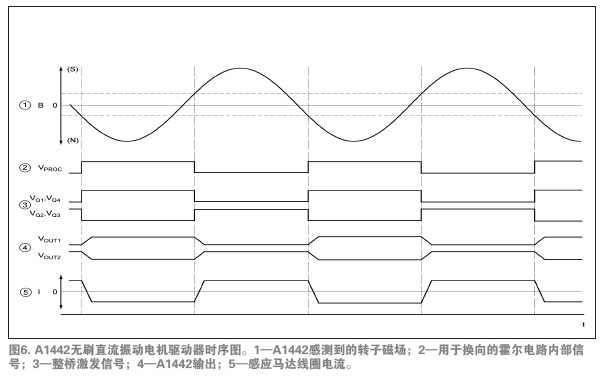 A1442是驅(qū)動(dòng)馬達(dá)唯一必須的的IC。圖5所示的功能模塊圖說明了設(shè)備運(yùn)行和先進(jìn)的特性。注意圖4和圖5中,采用集成的霍爾傳感器免除了外部霍爾傳感器,從而減少了馬達(dá)PCB元件數(shù)量。唯一所需的外部元件是一種標(biāo)準(zhǔn)電路特性——位于應(yīng)用馬達(dá)安裝PCB上的0.1µF的旁路電容,它用于降低在開關(guān)電源的電感負(fù)載時(shí)產(chǎn)生的瞬時(shí)電壓峰值。