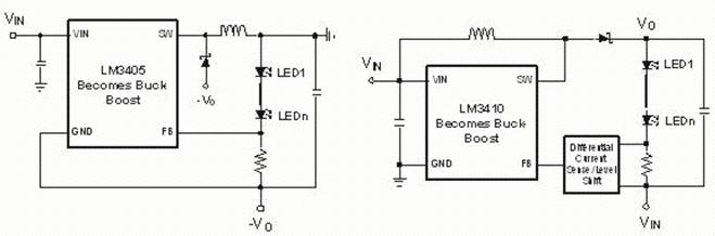單電感Buck-boost可以像Buck或Boost調(diào)節(jié)器一樣組建,使它在系統(tǒng)成本的角度來(lái)講很吸引人。這種拓?fù)涞囊粋€(gè)缺點(diǎn)是Vo被反置(圖2a)或者以VIN為參照(圖2b)。測(cè)平移動(dòng)或者反偏電路必須要用一些轉(zhuǎn)換器。像boost轉(zhuǎn)換器,它們有一個(gè)不連續(xù)輸出電流,并且需要一個(gè)輸出電容來(lái)維持一個(gè)持續(xù)LED電流。功率MOSFET要承受一個(gè)峰值為IIN加上IF的電流還有一個(gè)峰值為VIN加上VO的電壓。