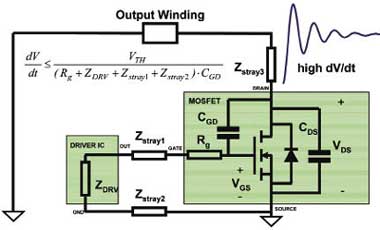 圖7解釋了讓柵極驅(qū)動器靠近功率MOSFET為什么如此有用。柵極驅(qū)動器的非零輸出阻抗ZDRV必須通過寄生阻抗Zstray1和Zstray2,以及柵極阻抗Rg來控制MOSFET,尤其是關(guān)斷。這時,漏極上的高dV/dt加上柵極路徑上的高阻抗,可能引起MOSFET的寄生導(dǎo)通。而利用極短的連線和功能強大的柵極驅(qū)動器,幾乎可以實現(xiàn)完美的開關(guān)。