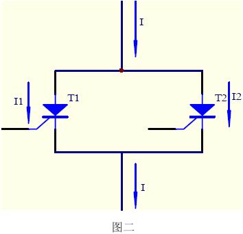 由于單個(gè)元件耐壓水平的提高,每個(gè)元件并聯(lián)工作以增大設(shè)備功率的情形更常見(jiàn),以兩只晶閘管并聯(lián)工作為例,如圖二所示。
