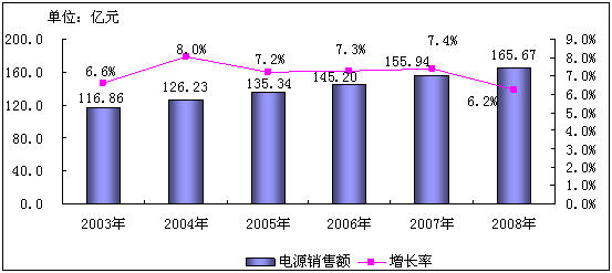2008年中國電源市場銷售額165.67億元,同比增長6.2%,受全球金融危機影響,電源市場銷售額增長率在近幾年中首次出現(xiàn)下滑。自2003年以來,隨著各行業(yè)信息化建設的不斷深入,中國電源市場一直處于穩(wěn)定發(fā)展態(tài)勢。2008年中國電源產(chǎn)品產(chǎn)量3163萬臺,同比增長5.7%。