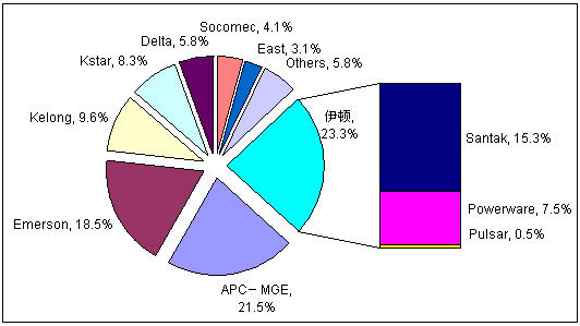 2006年以來,中國UPS市場開始了廠商之間一系列的并購整合,競爭格局開始重新洗牌,直到2008年,新的格局才基本確立。目前,市場第一陣營被國際三巨頭伊頓、施耐德、艾默生占據(jù),市場份額達到63.3%。而科華、科士達這兩個國內(nèi)自主品牌廠商也憑借良好的發(fā)展狀態(tài)和合理的市場策略脫穎而出,躋身UPS市場的第二陣營。