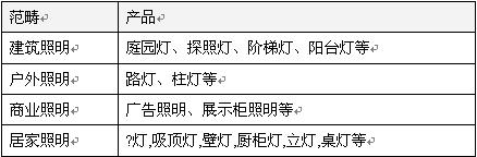 隨著技術(shù)的改善,LED燈具的用途已由過(guò)去數(shù)十年單純應(yīng)用在指示燈、信號(hào)燈等,逐步使用在手機(jī)背光源、車內(nèi)用照明、煞車燈、LCD電視、手提電腦背光源等輔助照明;而在近兩年內(nèi),其開(kāi)始成為主照明系統(tǒng),所應(yīng)用的范疇可涵蓋建筑、戶外、商業(yè)、及居家等,產(chǎn)品則分別有: