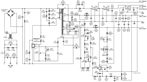 ±15VDC和+5VDC輔助輸出從線性穩(wěn)壓器獲得。為了限制線性穩(wěn)壓器(5V和15V)中的功率耗散,向變壓器T1另外添加了一個(gè)18V輸出。