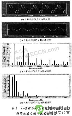 為了驗(yàn)證上述諧波檢測和控制方案的有效性以及由此構(gòu)成的基于DSP的并聯(lián)型有源電力濾波器是否能很好地補(bǔ)償諧波和無功電流,本文進(jìn)行了實(shí)驗(yàn)。采用阻性負(fù)載作為三相不控橋式整流器的負(fù)載,試驗(yàn)中在負(fù)載側(cè)接了1個(gè)2Ω的電阻。下面以A相為例給出實(shí)驗(yàn)波形。圖4分別給出了補(bǔ)償前后的負(fù)載電流波形和補(bǔ)償前后負(fù)載電流的頻譜圖。