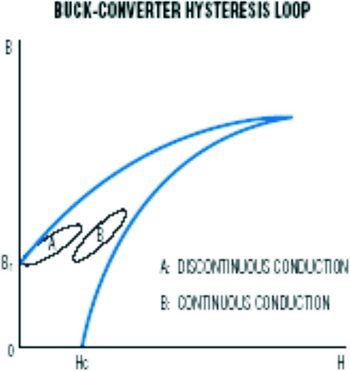 磁芯損耗主要是由于磁滯現(xiàn)象以及磁芯內(nèi)部傳導(dǎo)率或其他非線性參數(shù)的互感產(chǎn)生。在Buck拓撲結(jié)構(gòu)中,第一象限的B-H磁滯回線對磁芯損耗影響最大。在第一象限這個局部圖中,磁滯回線顯示了電感從初始電感量過渡到峰值電感量再回到初始電感量的過程。如果開關(guān)電源穩(wěn)定工作在不連續(xù)狀態(tài),磁滯回線會從剩余電感量(Br)過渡到峰值電感量(參考圖1)。如果開關(guān)電源工作在連續(xù)狀態(tài),那么磁滯回線將會從直流偏置點上升到曲線峰值,再回到直流偏置點。通過實驗可以確定磁滯回線的精確曲線形狀(基本上是橢圓曲線)。