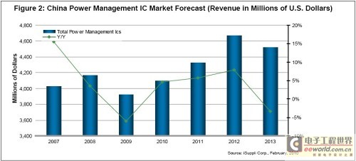 預(yù)計(jì)2009年中國PMIC營業(yè)收入降至39億美元,比2008年時的42億美元減少6%。但是,由于中國總體半導(dǎo)體市場復(fù)蘇和國內(nèi)需求巨大,預(yù)計(jì)該市場到2012年將增至47億美元。
