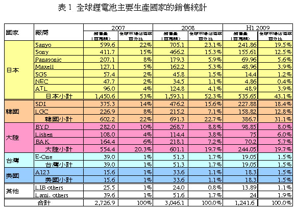 根據(jù)IIT2009年的統(tǒng)計(jì)預(yù)估,全球鋰電池芯銷售量約達(dá)30.5億顆,主要由日本的Sony、Sanyo、Panansonic、Maxell、SGS、NEC及ATL(被TDK購併),韓國的SDI(三星)及LGC(樂金化學(xué)),大陸的BYD(比亞迪)、BAK(比克)及Lishen(力神),臺灣的E-One(能元)及美國的A123所生產(chǎn),2007年到2009年銷售量統(tǒng)計(jì)如表一。